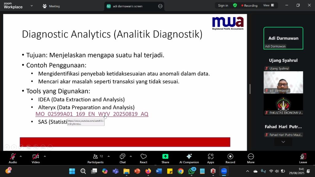 Workshop ini juga diisi dengan pemutakhiran materi, penyusunan modul digital, serta simulasi penggunaan aplikasi audit berbasis data analytics. Kegiatan tersebut diharapkan mampu memperkaya pengalaman belajar mahasiswa dan memperkuat daya saing lulusan di tingkat nasional maupun internasional.